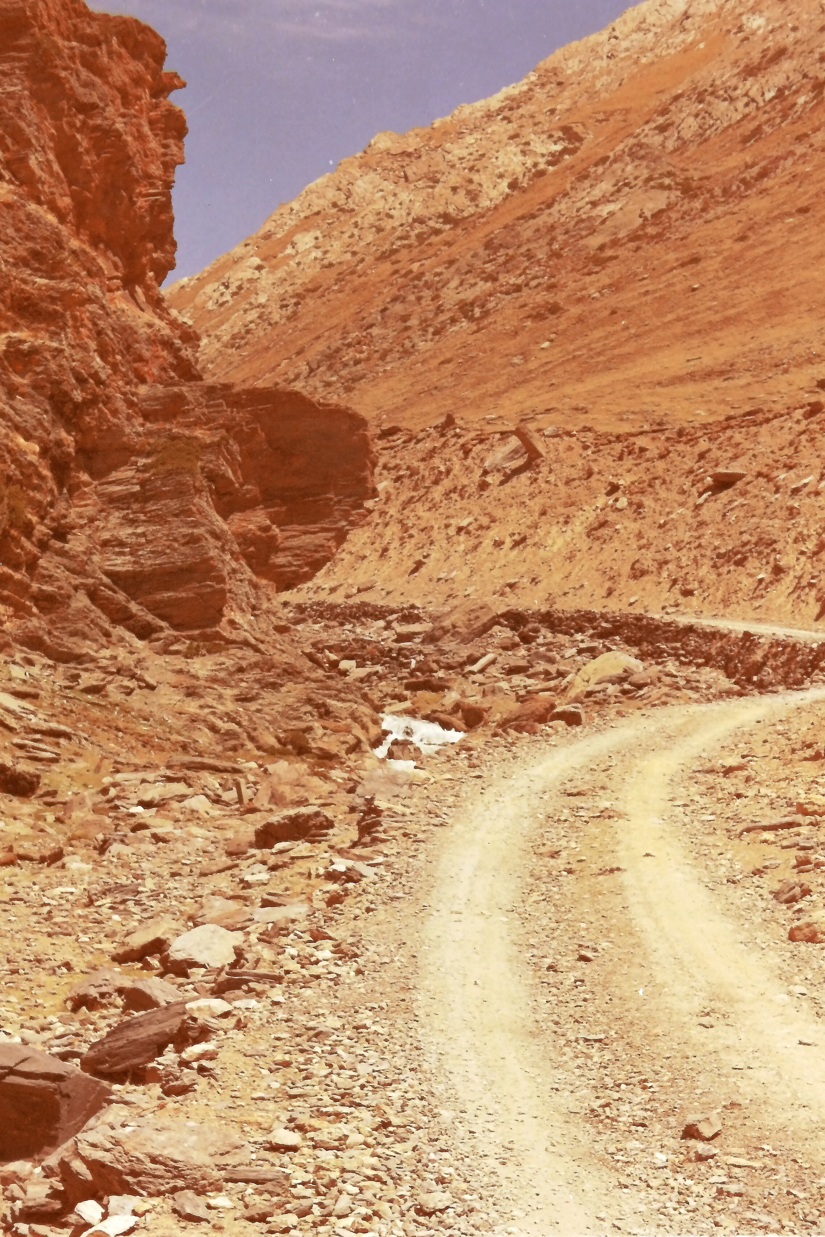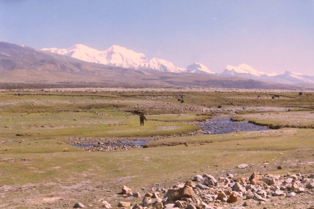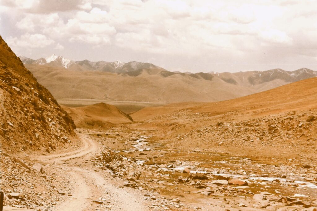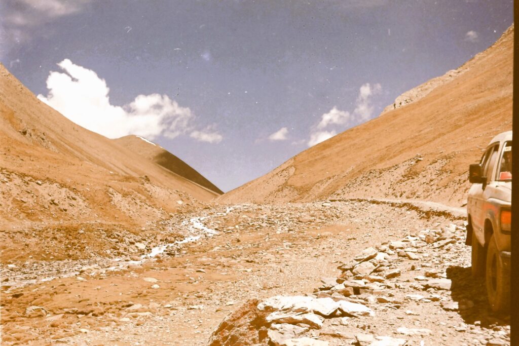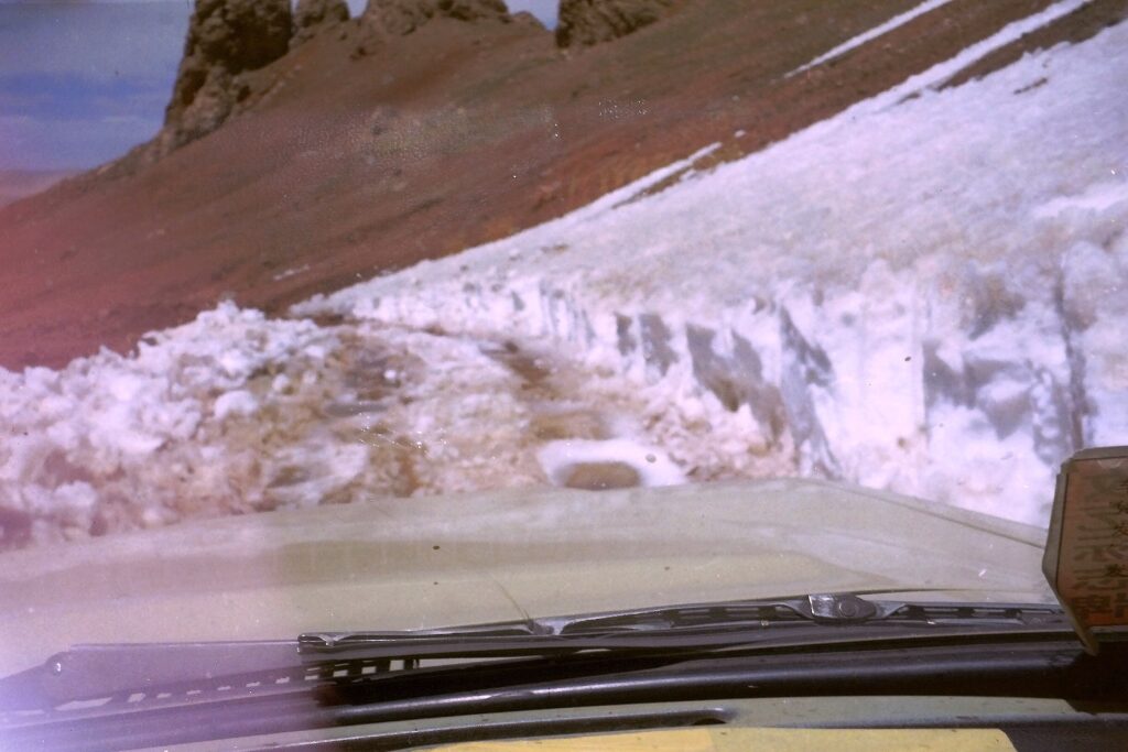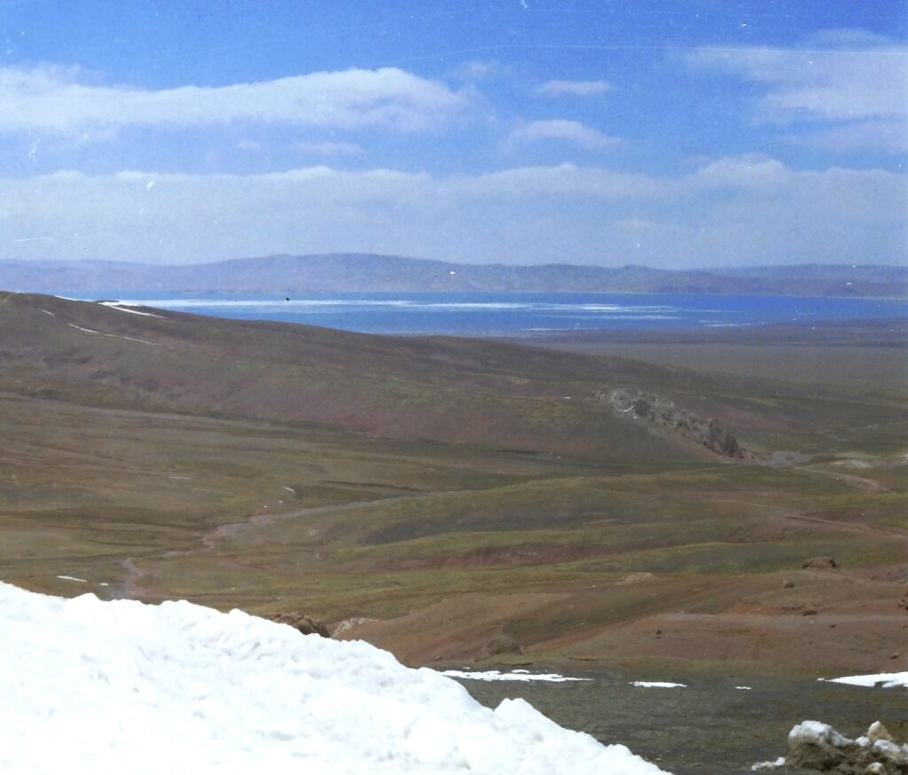 The ‘highway’ deteriorated the further along we went so when we eventually came to the mountain track, we were well used to being bashed about. Along the bare, rocky terrain, the track rose to around 5,000m. and the crucial pass we needed to negotiate. Fortunately, a path had been recently hacked into the metre-thick snow, and we were able to slither and bump away down to the 4,800m plain, views of the lake and the lower surrounds giving hints of what to expect geographically. But we would never have guessed what awaited us.