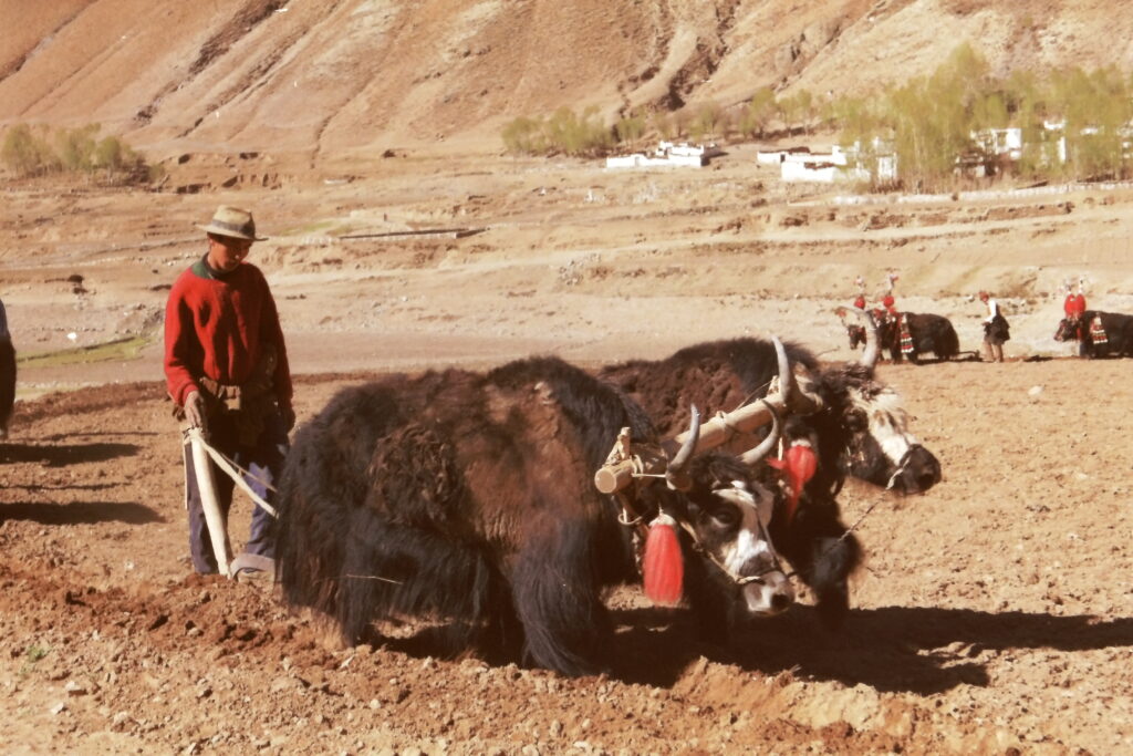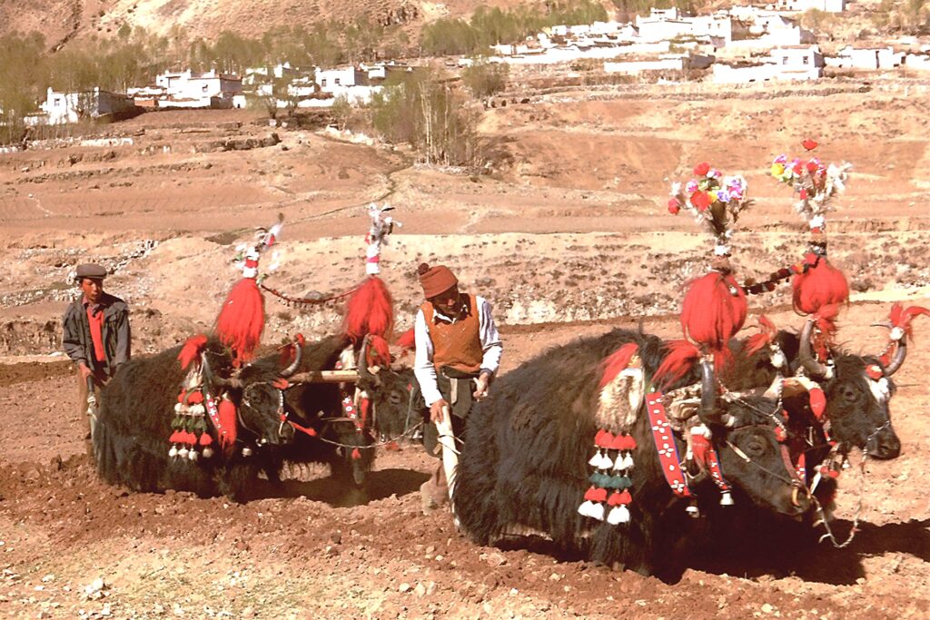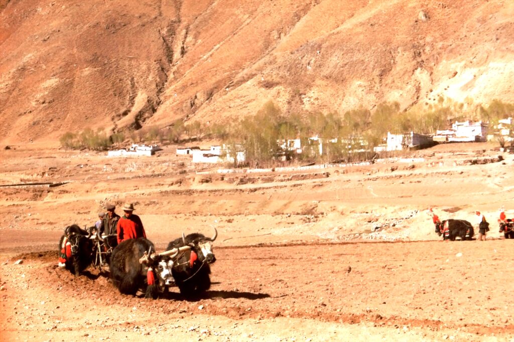 At one point we were passing a small village that was set back on higher ground, the flat ‘area below the village being ploughed by gaily decorated yak teams, traditional red being the dominant colour with man and beast.
