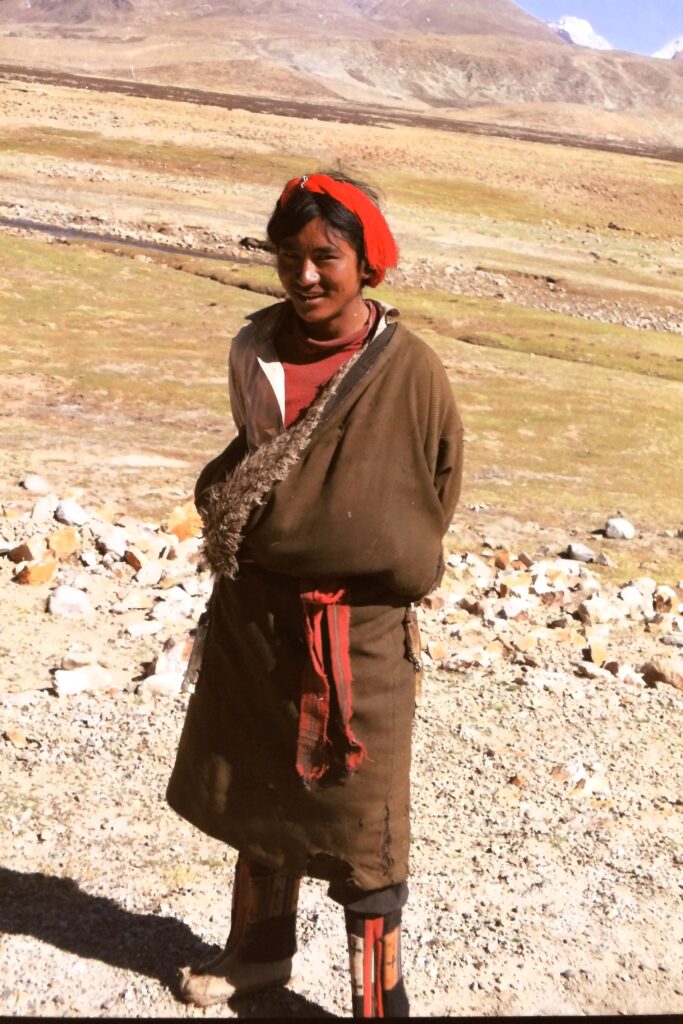 Further along, during a pee break (ladies to the left, gentlemen to the right), we saw a lone figure coming quickly towards us from the fields, a yak herd spread out in the distance. It was a young man, wearing traditional wrap-around over-garb with the pouched area created at the front where handy items, or just your arm, can be stored. He ran to about 20 metres from us and just stood there looking inquiringly and smiling. We, pretty much, did the same thing for a while, then we exchanged big smiles and waves as we continued on our little adventure.